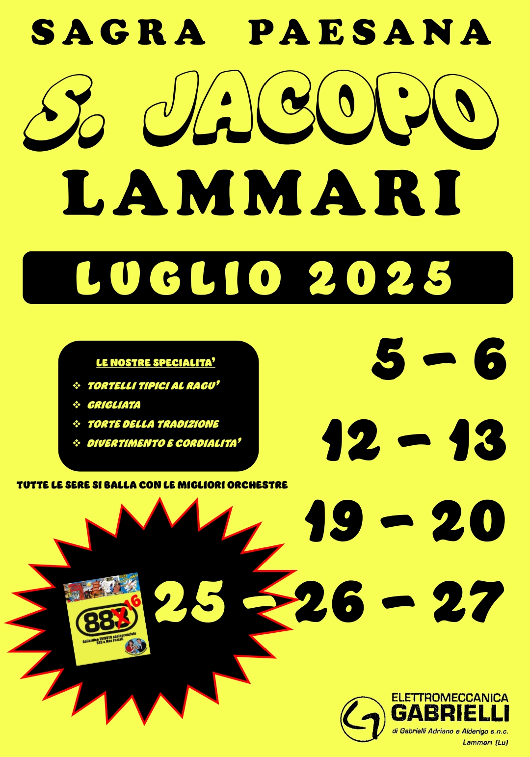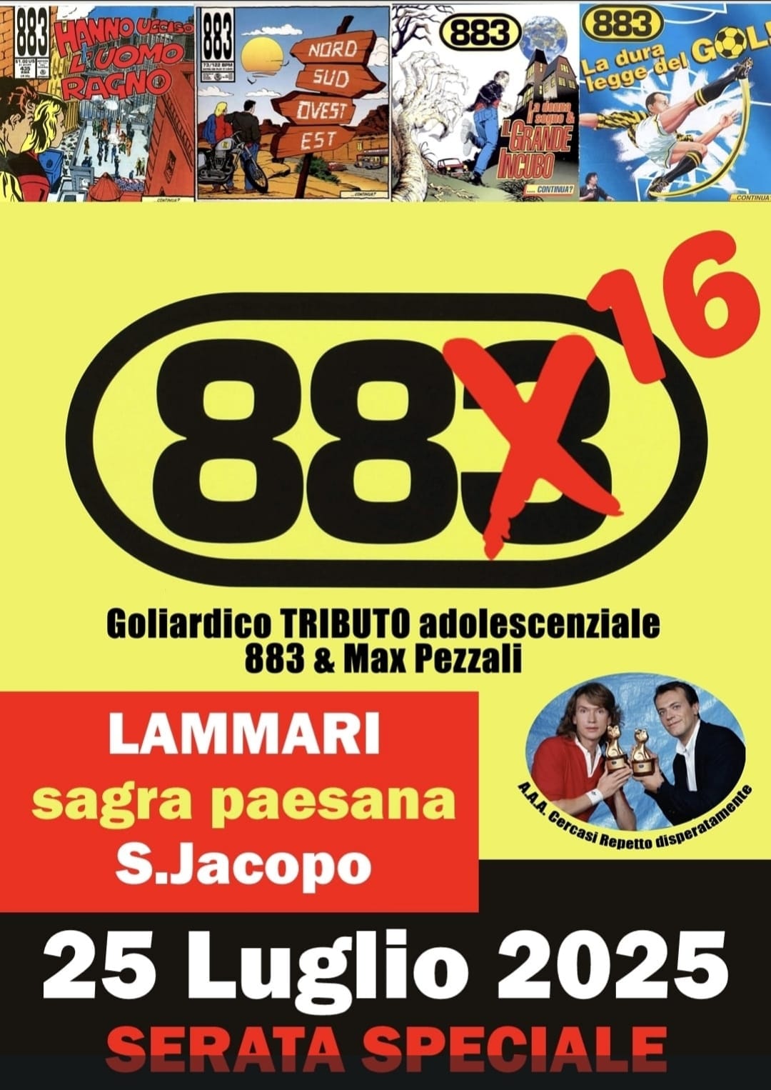 Il 25 luglio evento speciale con gli 88sedici il gruppo musicale che offrià un tributo agli 883 e a Max Pezzali proponendo i loro brani più famosi.